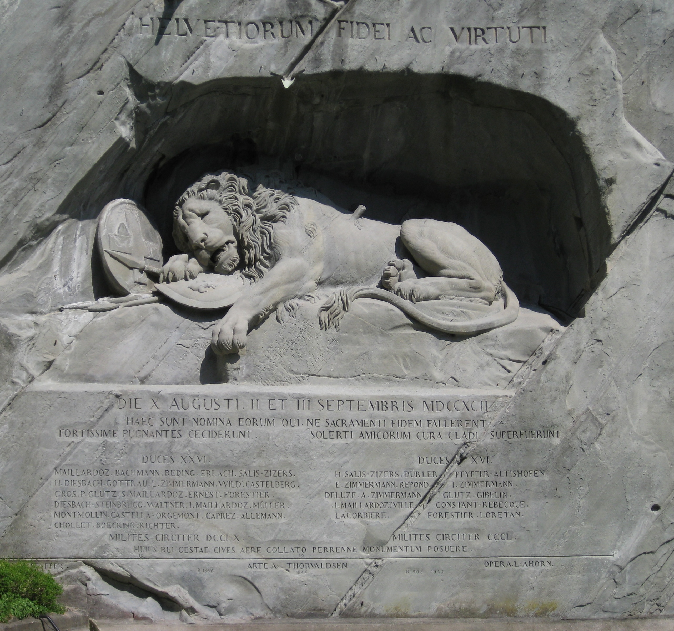 - 早餐后,前往卢塞恩。客人可乘坐【黄金列车】前往卢塞恩.导游可以开车过去等客人。随后参观【狮子纪念碑】。它是雕刻在整块崖壁上的石像.是为了纪念在1792年的8月10日为保护法国路易16世家族的安全而牺牲的786名瑞士雇佣军,之后返回因特拉肯。