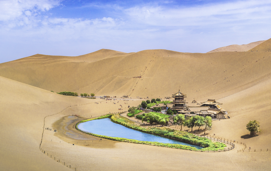 - Crescent Moon Spring in Mingsha Mountain is famous for the sound of the sand. It is divided into five colors of red, yellow, green, white and black quicksand and is the last tear in the desert.
