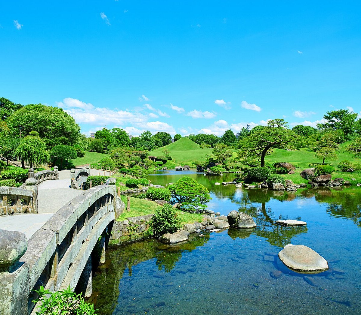 - 水前寺成趣园(绝美的日式庭院)水前寺江津湖涌水群更是被认定为平成名水百选之一,该园是由阿苏山伏流水涌出之池为中心的桃山式回游庭园,以筑山、浮石、草坪和松树等观赏用树木来模仿东海道五十三次之景胜。